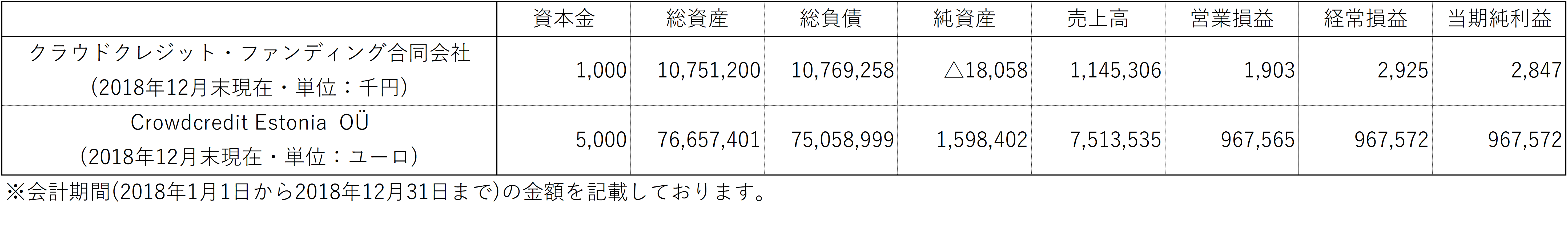 1.当社(クラウドクレジット株式会社)は合同会社(クラウドクレジット・ファンディング合同会社)とエストニアグループ会社(Crowdcredit Estonia OÜ)の議決権を100%保有しております。また当社の代表取締役である杉山智行は、合同会社の代表社員である当社の職務執行者およびエストニアグループ会社のDirectorをそれぞれ兼務しており、両社の財務及び営業又は事業の方針の決定に関して影響を与える立場にあります。