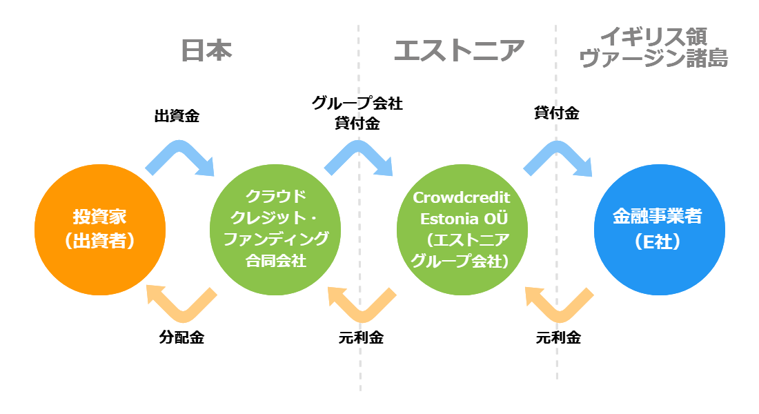 本ファンドはイギリス領ヴァージン諸島に籍を置き、ロシア、ポーランド、南アフリカで事業展開を行う金融事業者(E社)に対して、クラウドクレジットのエストニア子会社(Crowdcredit Estonia OÜ) が貸付を行います。