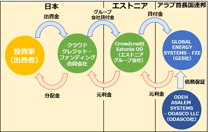 本ファンドに関係する国:日本国(当社およびクラウドクレジット・ファンディングの所在国)、エストニア共和国(エストニアグループ会社の所在国)、アラブ首長国連邦(実質的な貸付先及び信用補完先の所在国)