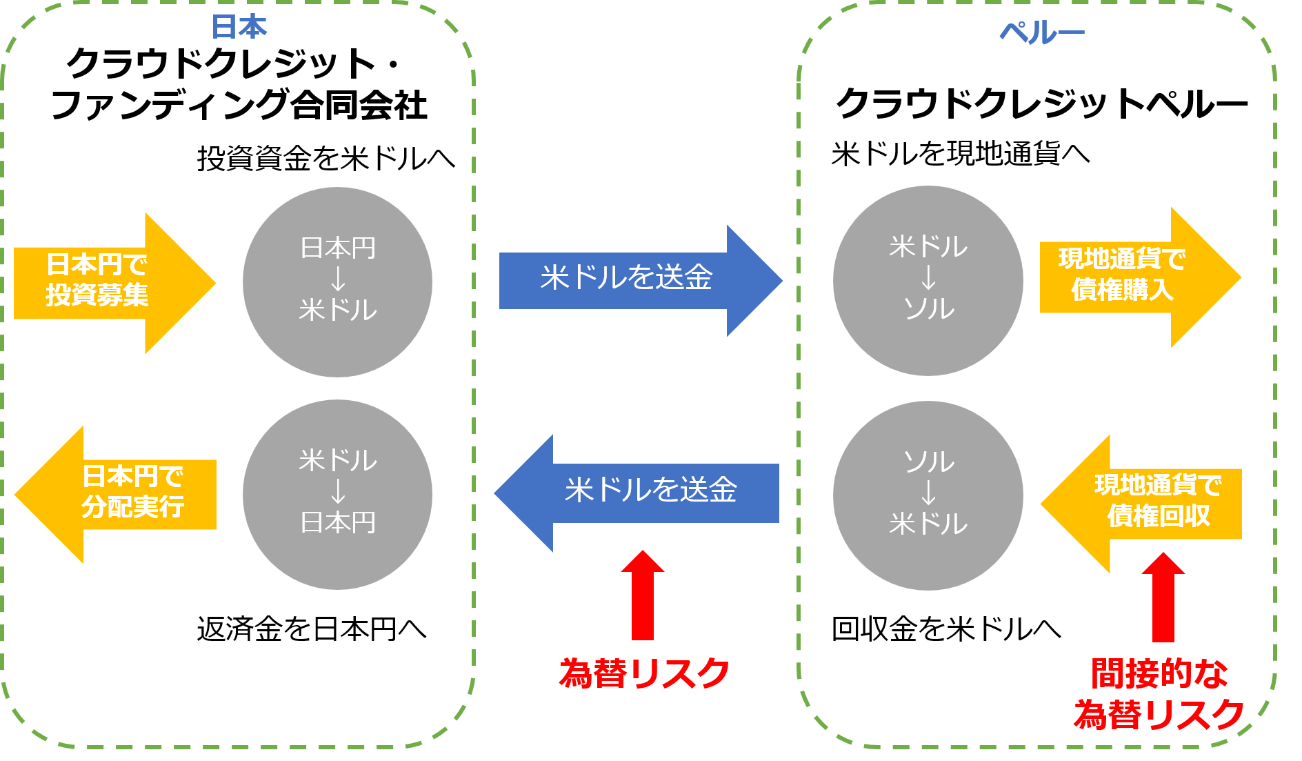 合同会社はペルーグループ会社に円建てで貸付を行いますが、ペルーグループ会社はソル建てで投資を行うため、お客様は間接的にソル/円の為替リスクを負うことになります。また、ペルーグループ会社から日本への借入金の返済時にはドル建てで送金しますが、お客様には送金から日本への着金までにドル/円の為替レートのリスクを負って頂くこととなります。レートの変動によって分配金は増減します。