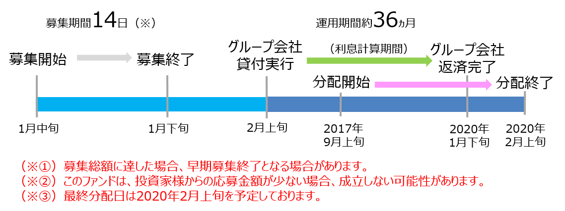 本プロジェクトはグループ会社貸付実行日から利息計算を行い、2017年9月初旬から分配金をお支払いたします。