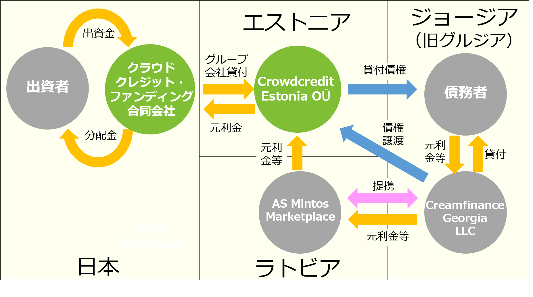案件② エストニアグループ会社は、MintosというP2Pレンディングプラットフォームを介して、ジョージア(旧グルジア共和国)の会社Creamfinance Georgia LLCの取り扱う個人向けローンの購入を行います。資金需要の開拓、ローン審査・貸付及び管理・回収はCreamfinance Georigia LLCが行います。Creamfinance Georgia LLCは、東欧各地で個人向け貸付事業を行っているCream Finance Holding Ltd
