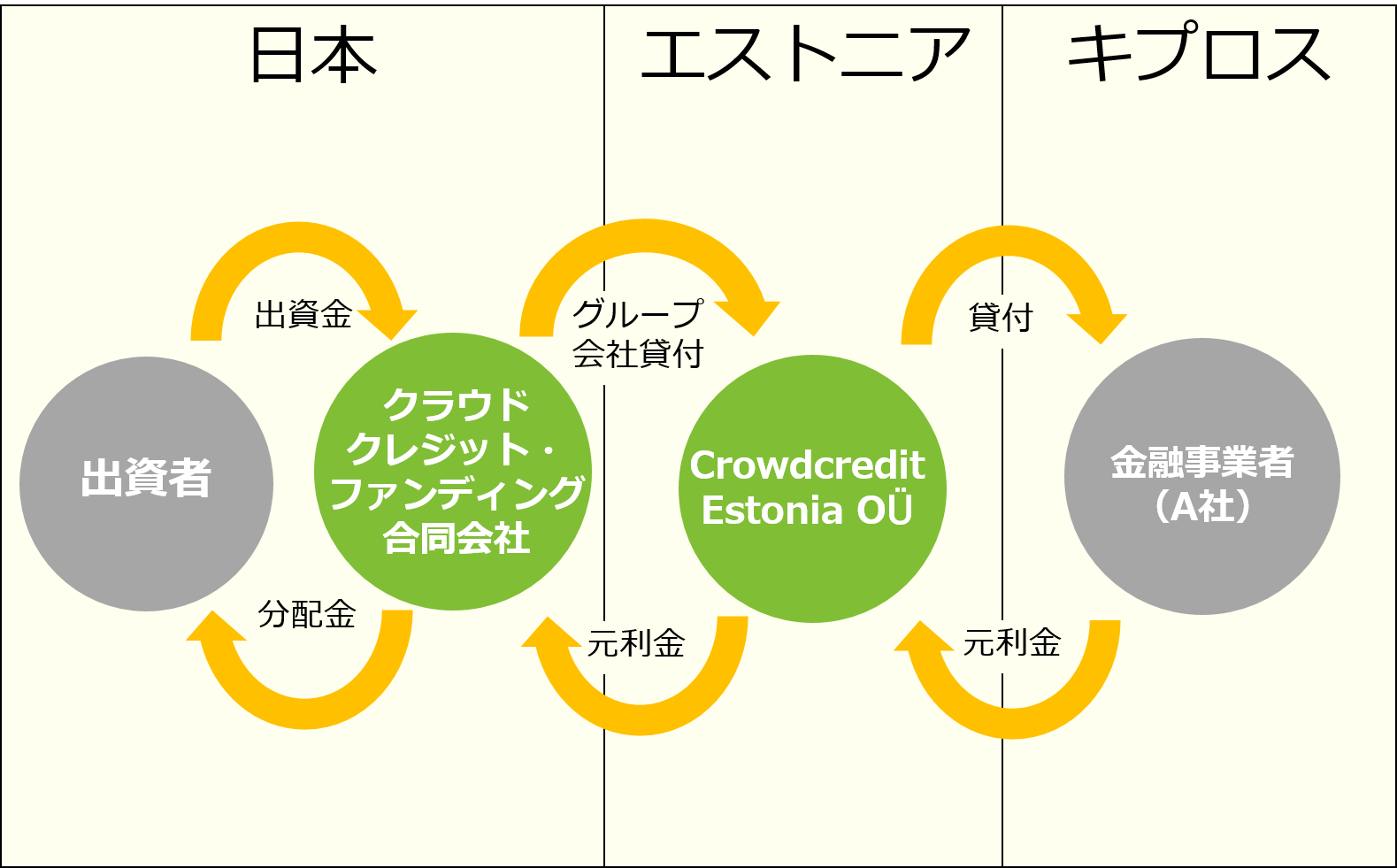本ファンドにおいて、クラウドクレジット・ファンディング合同会社(以下、合同会社)が貸付を行うエストニアグループ会社は金融事業者(A社)グループのキプロス籍持ち株会社(親会社)からの返済金および仲介業者であるAS Mintos Marketplaceを介して購入したCreamfinance Georgia LLCが貸し付けた債権の回収金を原資としてグループ会社貸付の元利金を返済します。そのため、金融事業者