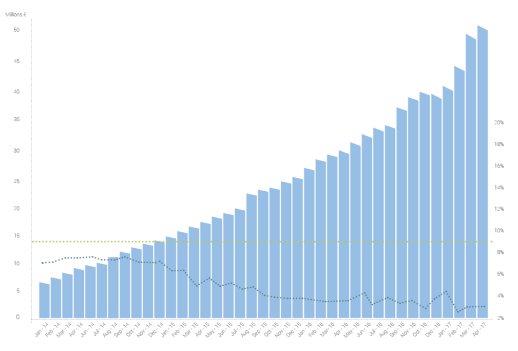 A社グループは創立以来順調に業績を伸ばし、2016年の貸出総額が1億ユーロを越え(=1.02億ユーロ)ました。これは、A社グループの2015年実績対比で69%の増加となっております。また、2016年の収益は前年比38%増の30.4百万ユーロとなりました。
