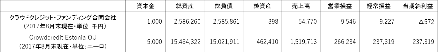 1.当社(クラウドクレジット株式会社)は合同会社(クラウドクレジット・ファンディング合同会社)とエストニアグループ会社(Crowdcredit Estonia OÜ)の議決権を100%保有しております。また当社の代表取締役である杉山智行は、合同会社の代表社員である当社の職務執行者およびエストニアグループ会社のDirectorをそれぞれ兼務しており、両社の財務及び営業又は事業の方針の決定に関して影響を与える立場にあります。