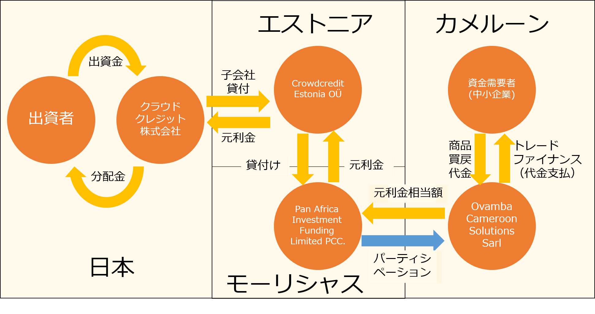 クラウドクレジット株式会社(以下、当社)はエストニア子会社に対して貸付けを行い、エストニア子会社はこの借入金を原資として、現地提携企業Ovamba Cameroon Solutions Sarl(以下、Ovamba社)グループのモーリシャス法人であるPan Africa Investment Funding Limited PCC.への貸付けを実行します。Pan Africa Investment Funding Limited PCC. はカメルーン国内の中小事業者に対する与信行為を行うOvamba社に対し、パーティシペーション(参加 ※)を行います。資金需要の開拓、トレードファイナンスに係る審査及び管理はOvamba社が行います。お客様には、当社の子会社貸付事業に対して出資いただきます。